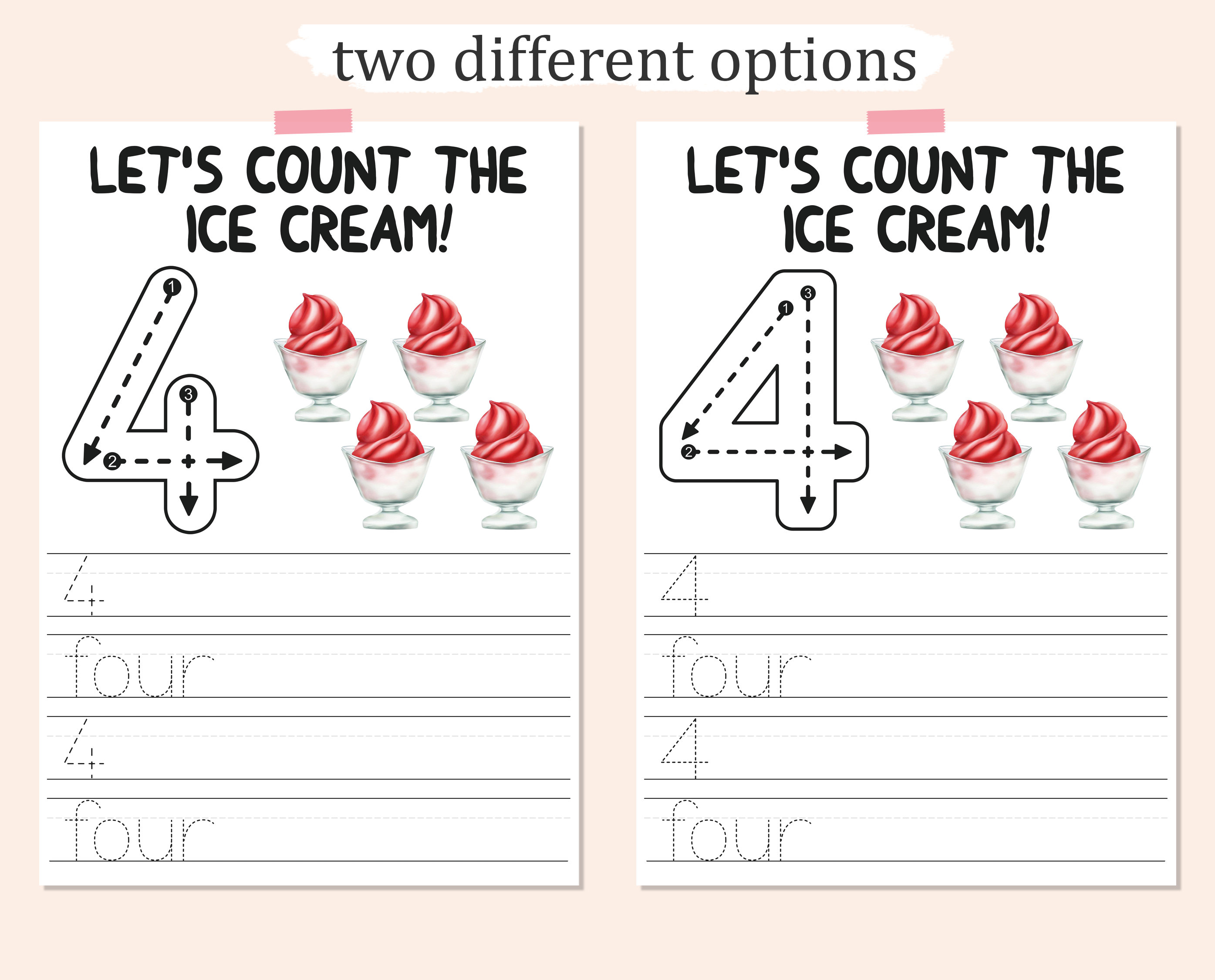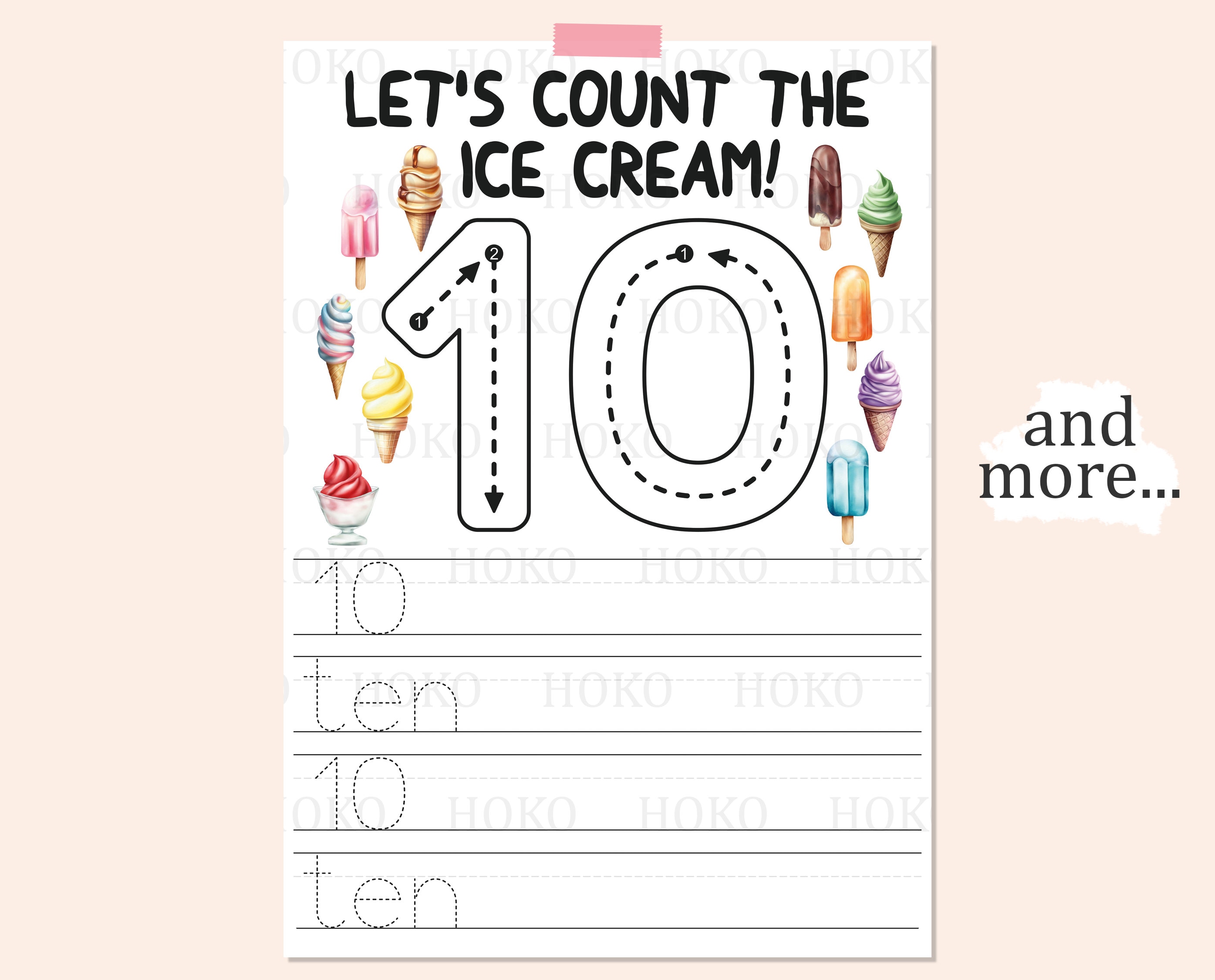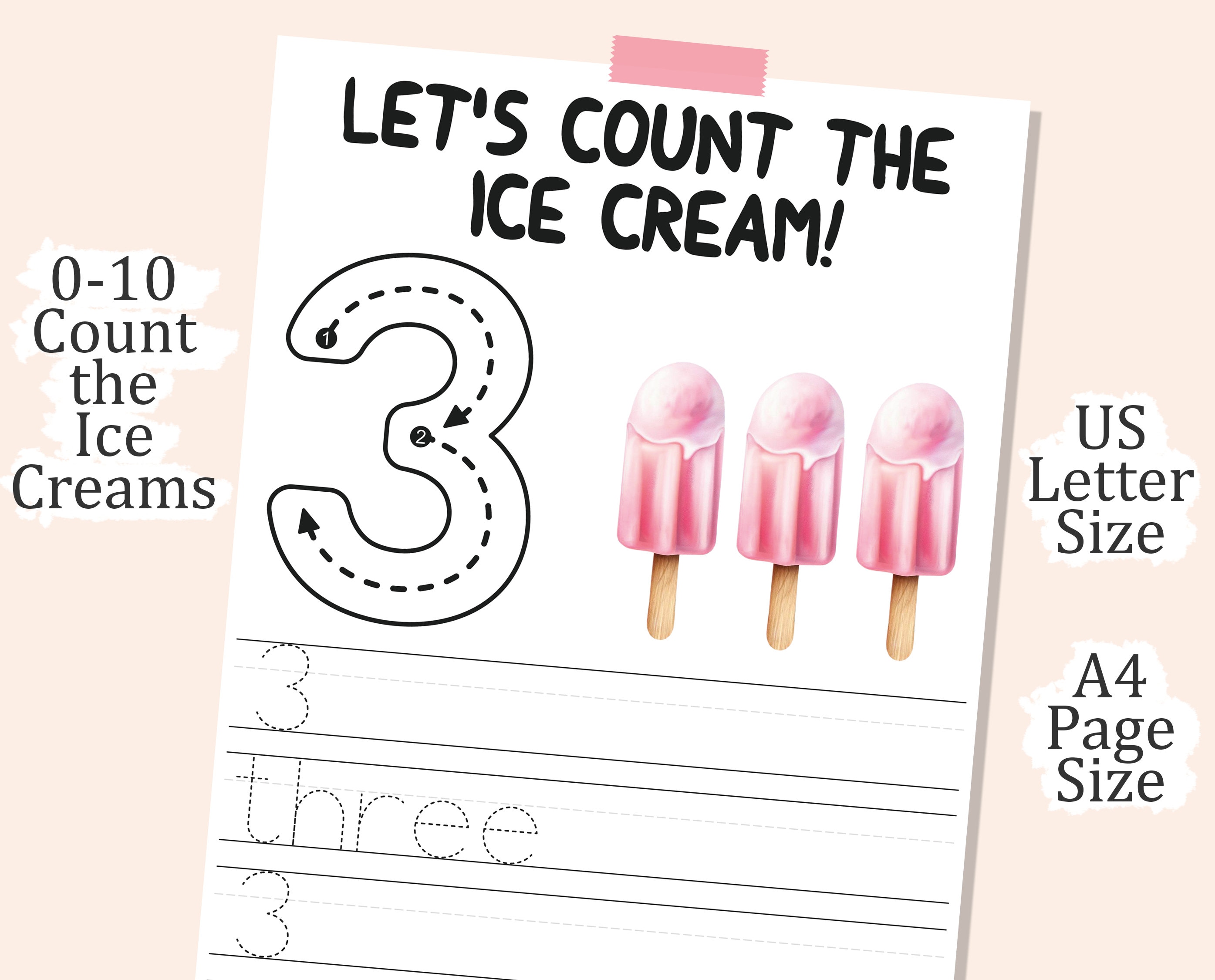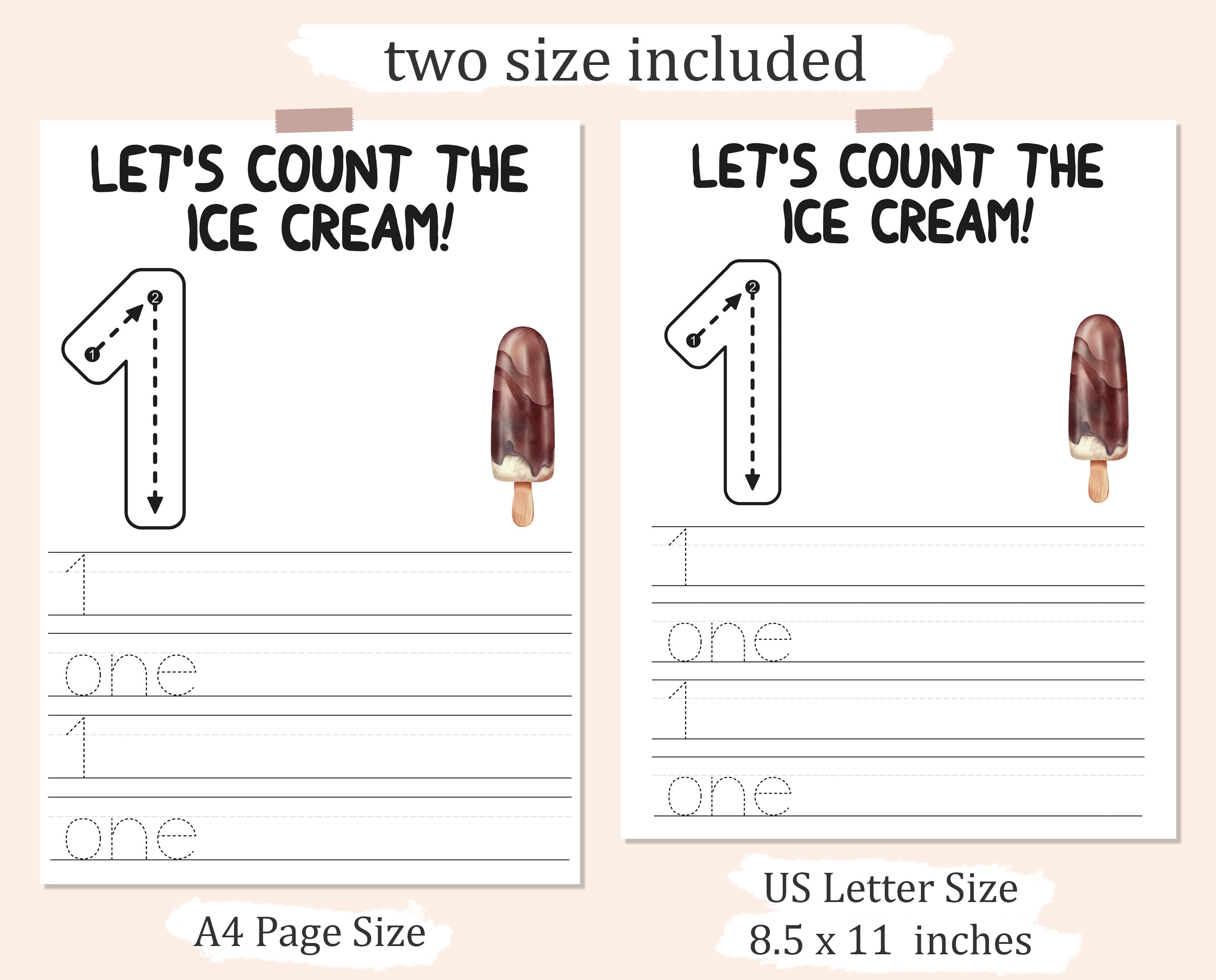 These worksheets feature colorful ice creams to help kids learn to count from 0 to 10. The worksheets are available in both A4 and US letter size so you can print them at home or school.