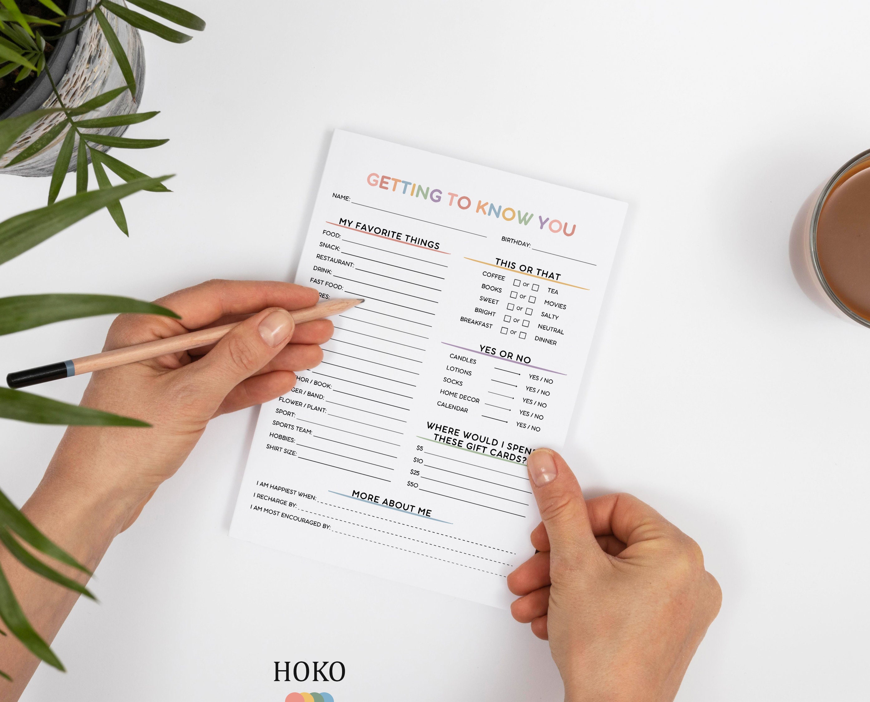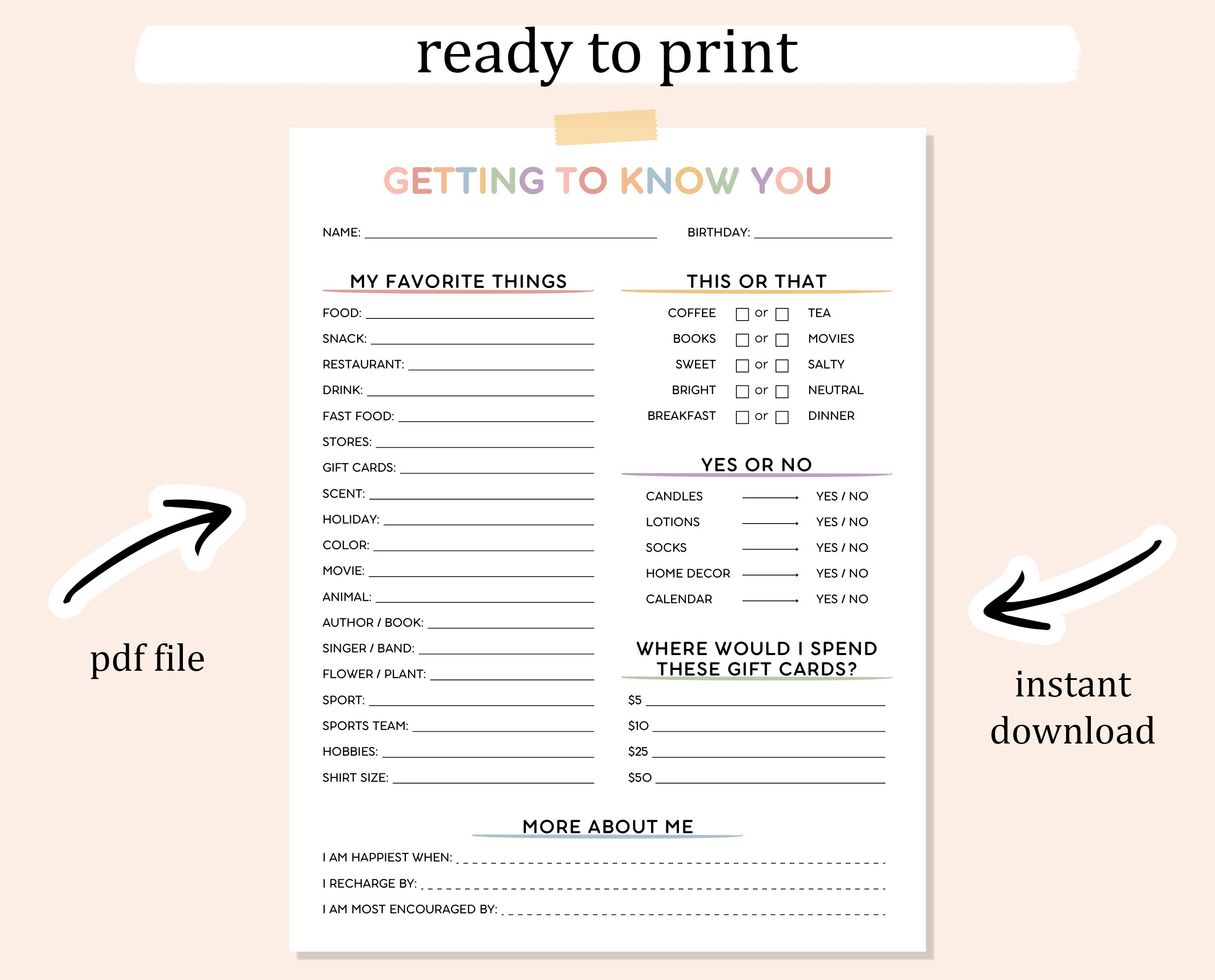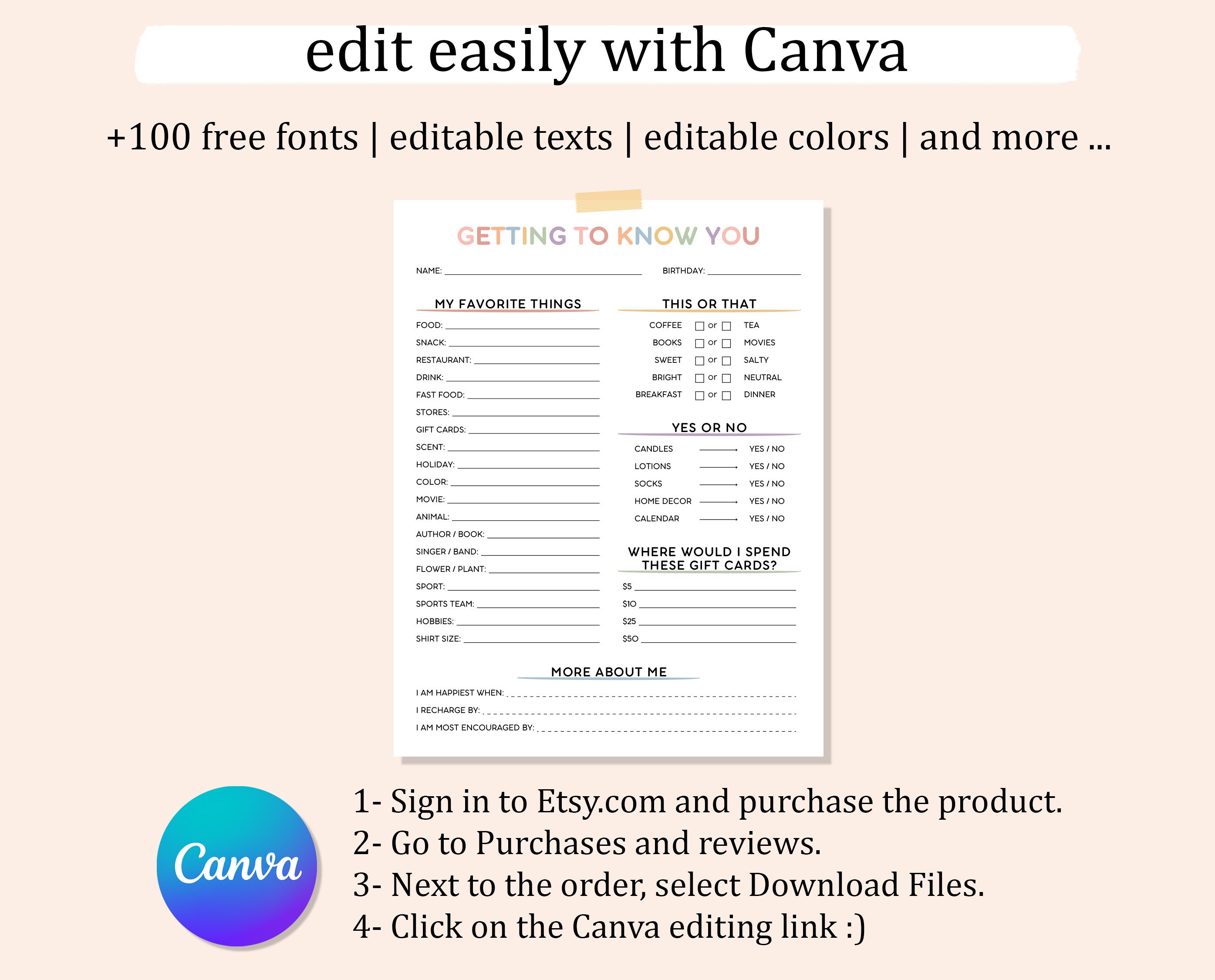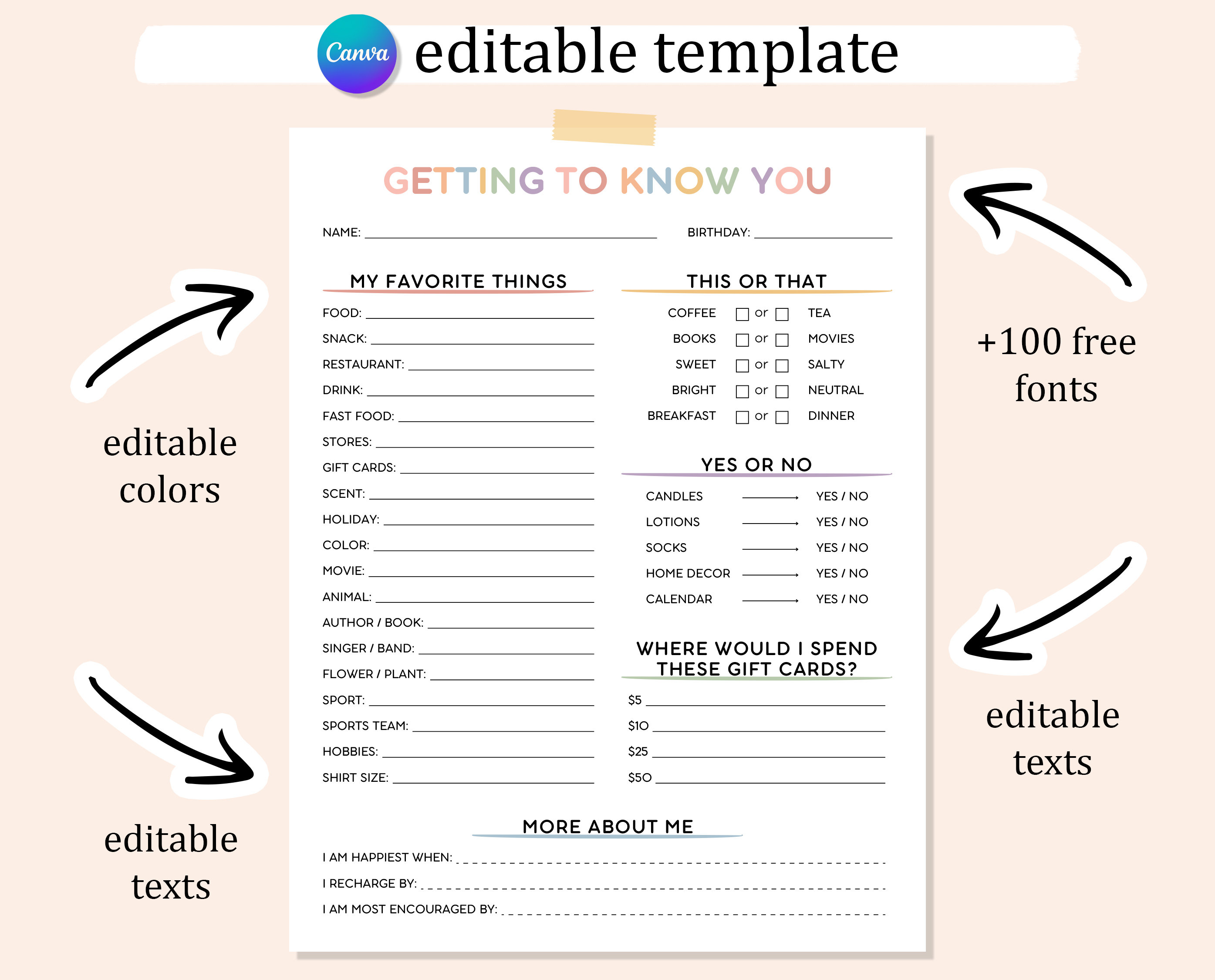 Unlock the charm of personal connection with our editable Get to Know You template! Perfectly sized for US Letter dimensions, this PDF download features sections like "My Favorite Things," "This or That," "Spend These Gift Cards," and "More About Me." It's ready to print, with easy customization options available on Canva, allowing you to tweak fonts, sizes, and colors to suit your style.